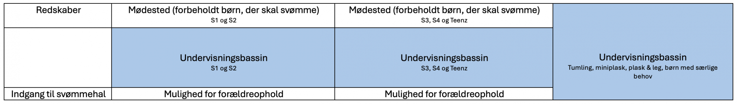 Der er adgang til omklædningsrummet 15 minutter før din svømmeundervisning starter.